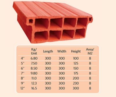 Clay hollow blocks (300x300x100mm) for suspended slab construction. Available in 4″ to 12″ depths. Ideal for structural flooring.