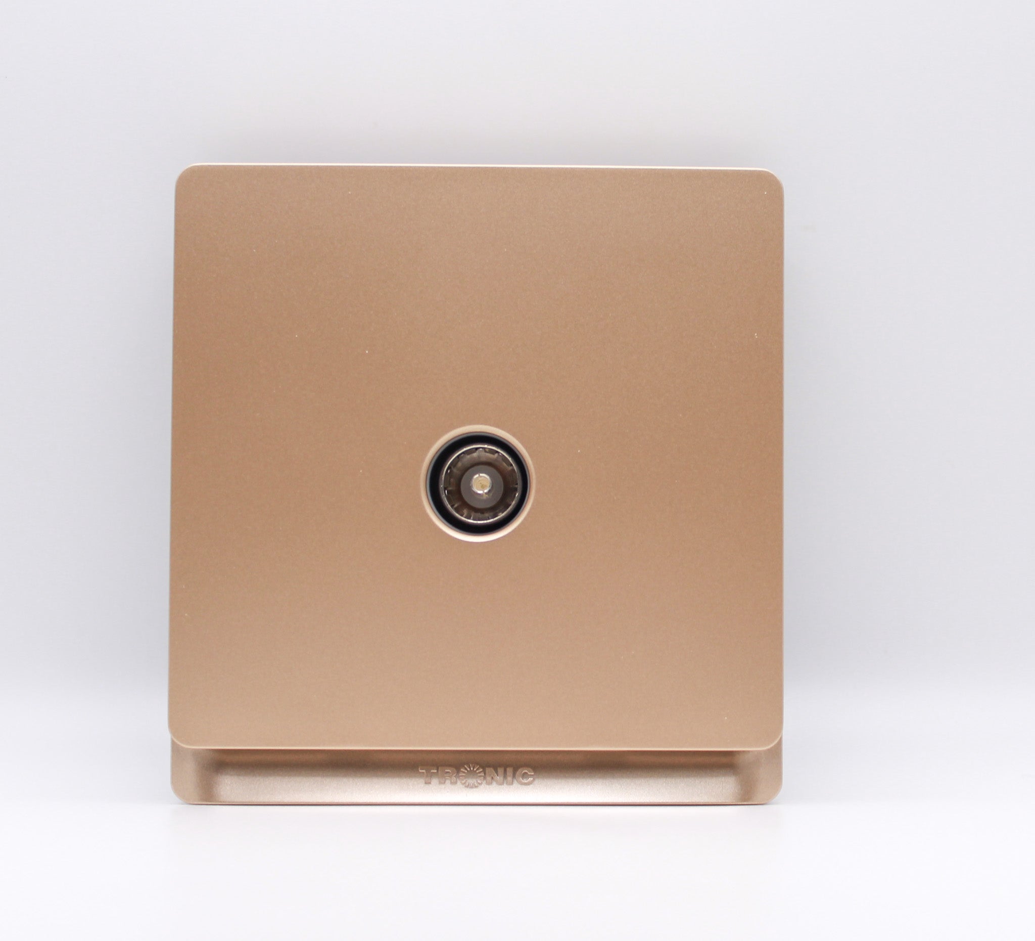This premium range Tronic television socket in gold provides a screwless finish, is slim, has smooth edges and has a shiny surface to fit into the modern style of ones home or office. Television sockets are used to provide the connection between a television or signal receiver and the cable that runs to the aerial. They are commonly referred to as aerial or coaxial sockets and are typically found in most homes as well as commercial premises.